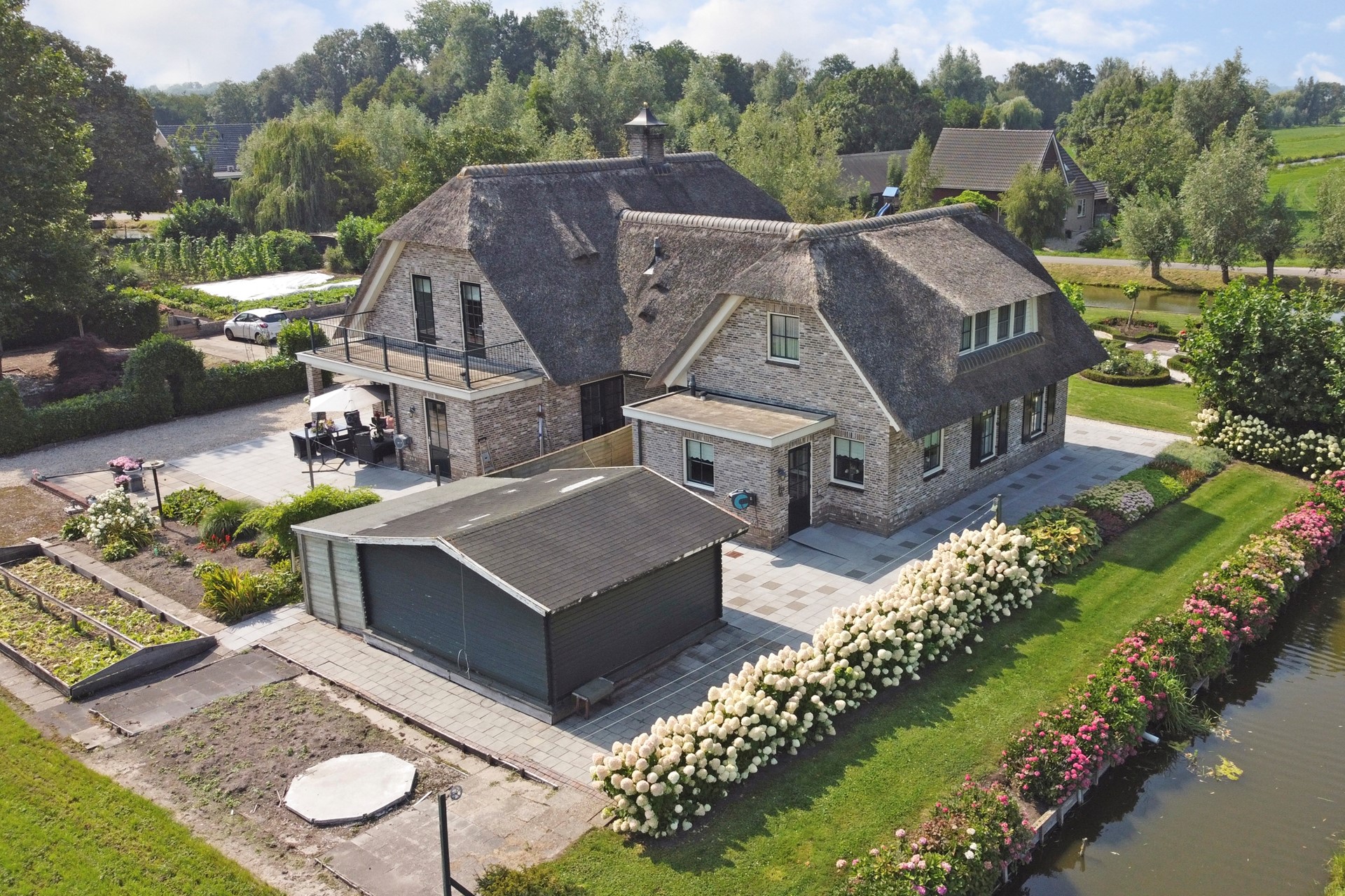De tuin en het erf beslaan samen circa 3.000 m² en zijn in 2021 grotendeels voorzien van een nieuwe beschoeiing, waardoor de waterkant er verzorgd bijligt. Daarnaast beschikt het perceel over een foliekas, bloemenkas en een verkooppunt voor de eigen teelt, compleet met een tweede inrit, wat extra mogelijkheden biedt voor een hobbykwekerij of verkoop aan huis.