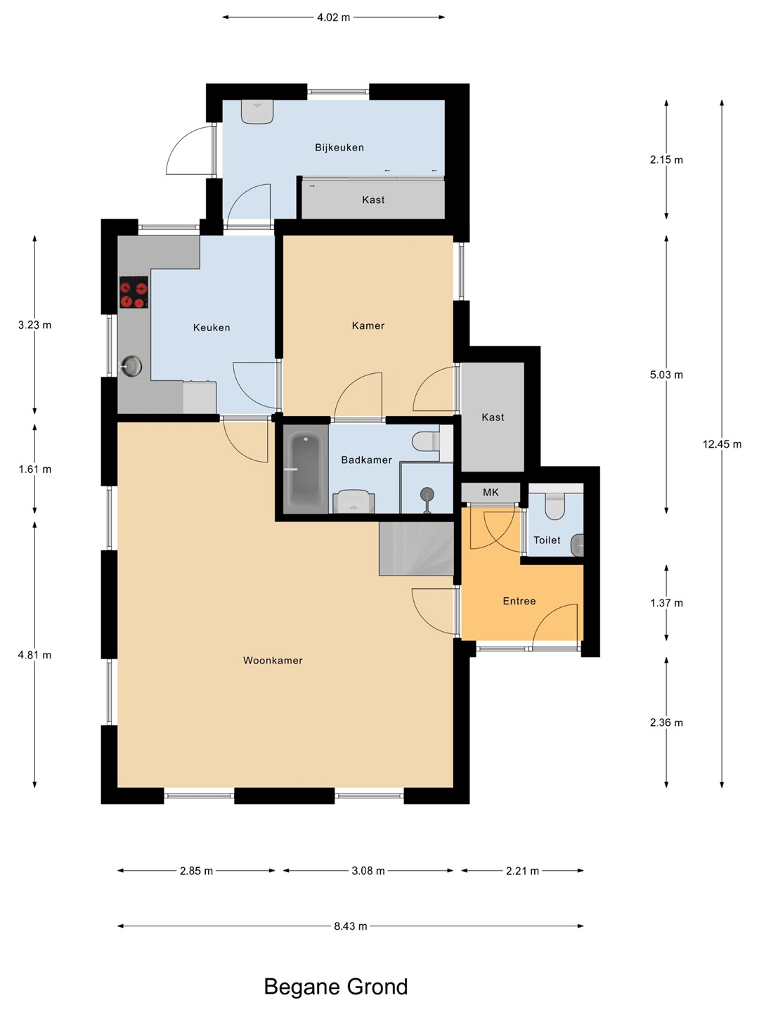 Begane grond: hal met entree, toilet, meterkast met gas-/elektra-/watermeter, telefoonaansluiting (deze wordt ook gebruikt voor de internetverbinding), hoofdslaapkamer met badkamer voorzien van separate douche, wastafel en ligbad, woonkamer (ca. 55 m²) met schouw en openhaard, woonkeuken met ruim keukenblok, erker en openslaande deuren naar het achterterras (deels overdekt), bijkeuken met garderobe, kastenwand en wasmachine- en droger aansluiting en achteruitgang naar buitenterras.