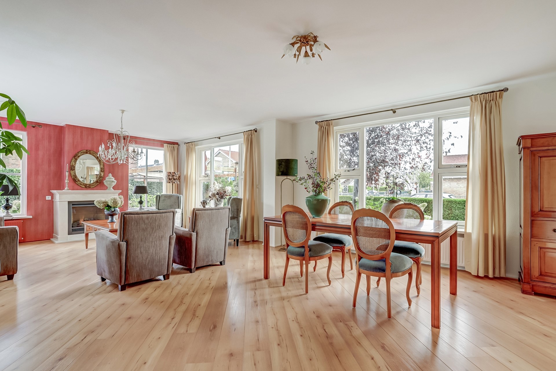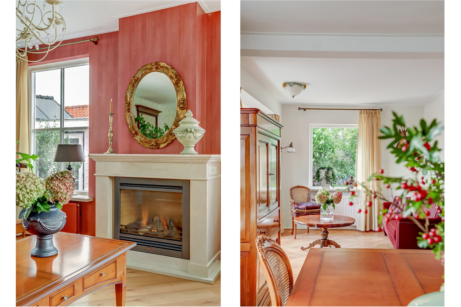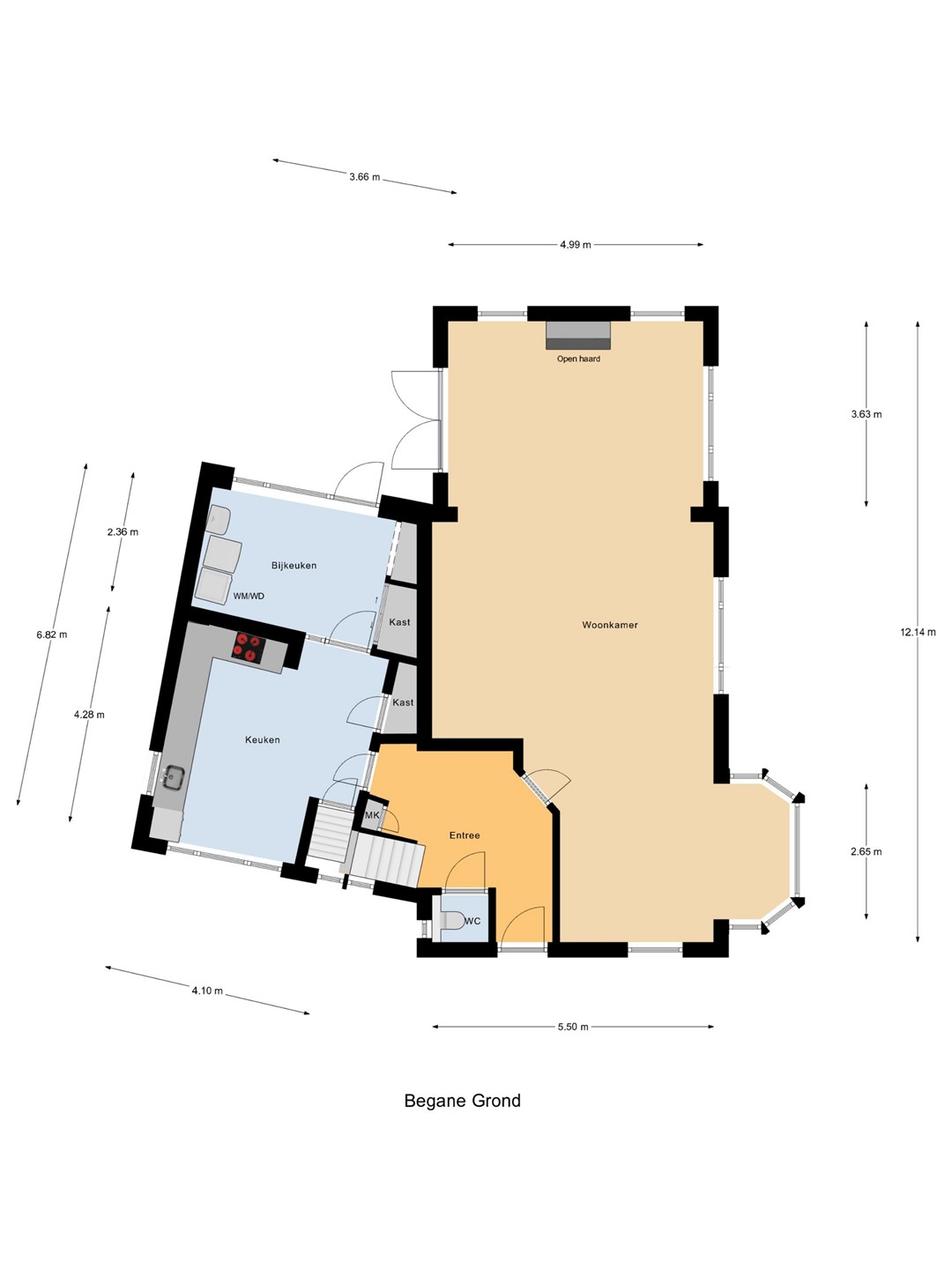 Begane grond: Bij binnenkomst wordt u verwelkomd in de ruime hal waar zich de meterkast, het toilet en de trap naar de eerste verdieping bevinden. Vanuit hier loopt u door naar de royale woonkamer met sfeervolle gashaard en schouw. Dankzij de vele raampartijen geniet u hier zoals gezegd van veel lichtinval, wat een aangename sfeer creëert in de woning. Via de hal bereikt u tevens de landelijke woonkeuken met eethoek. De keuken is ingericht in een hoekopstelling en uitgerust met een 5 pits inductieplaat, oven, combimagnetron, koelkast, vaatwasser en elektrische close-in boiler.