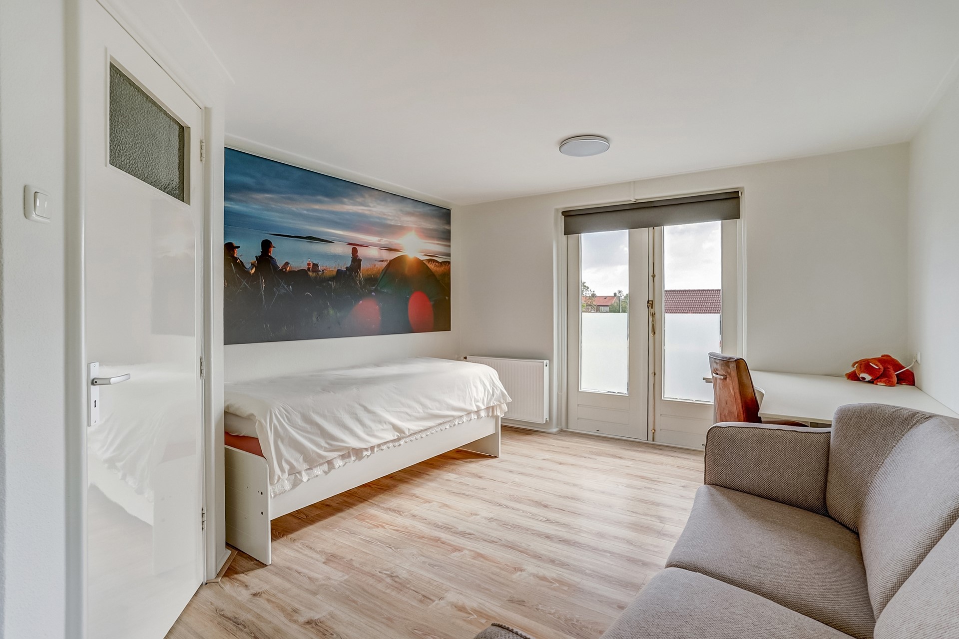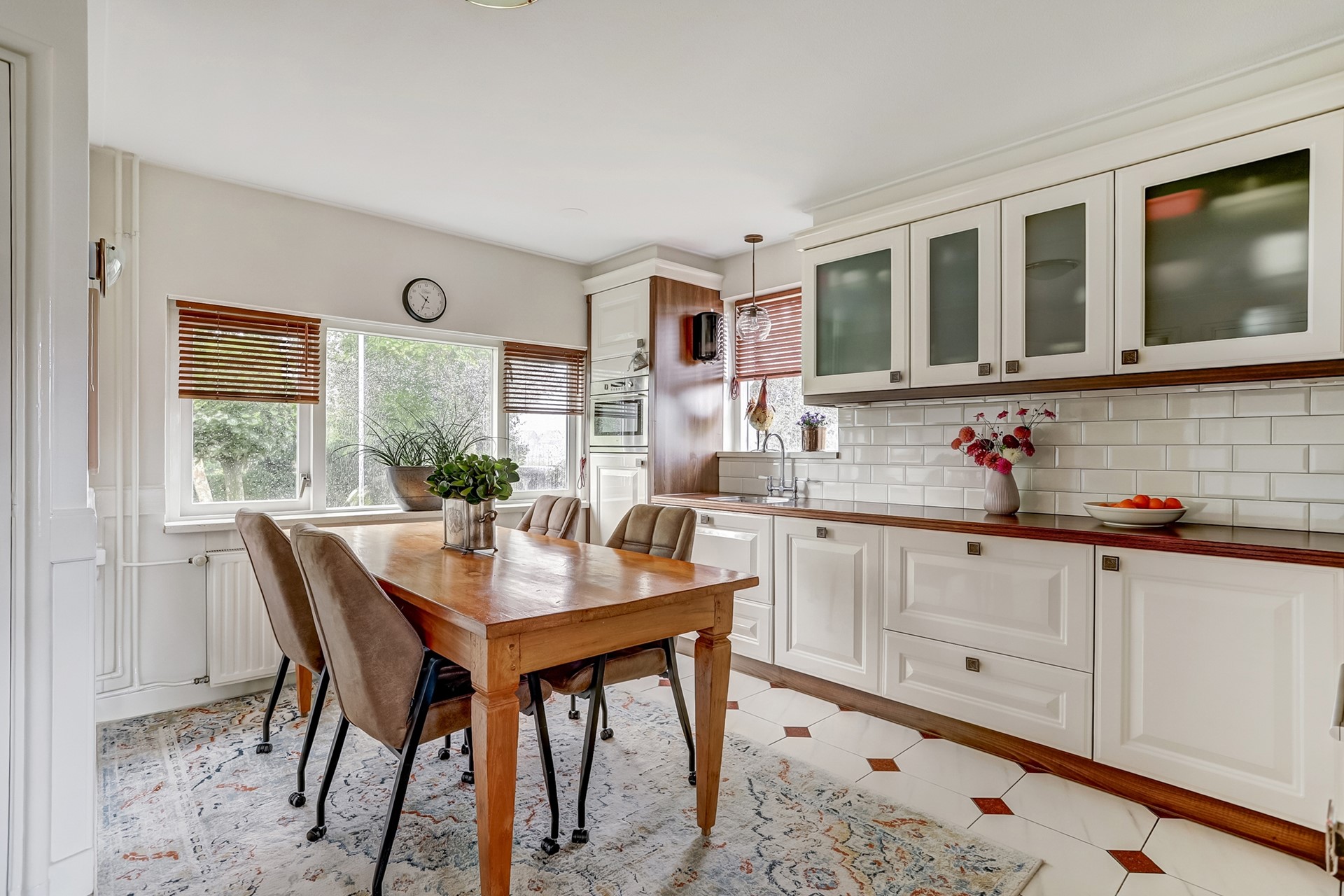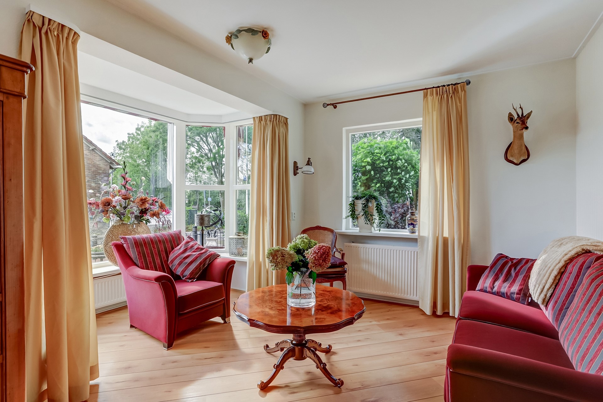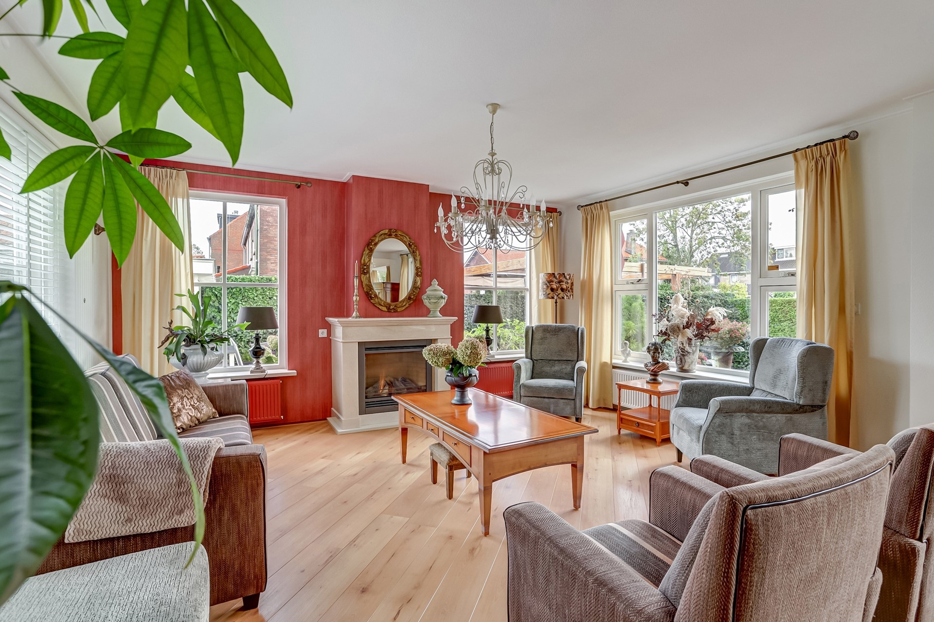 Begane grond: Bij binnenkomst wordt u verwelkomd in de ruime hal waar zich de meterkast, het toilet en de trap naar de eerste verdieping bevinden. Vanuit hier loopt u door naar de royale woonkamer met sfeervolle gashaard en schouw. Dankzij de vele raampartijen geniet u hier zoals gezegd van veel lichtinval, wat een aangename sfeer creëert in de woning. Via de hal bereikt u tevens de landelijke woonkeuken met eethoek. De keuken is ingericht in een hoekopstelling en uitgerust met een 5 pits inductieplaat, oven, combimagnetron, koelkast, vaatwasser en elektrische close-in boiler.