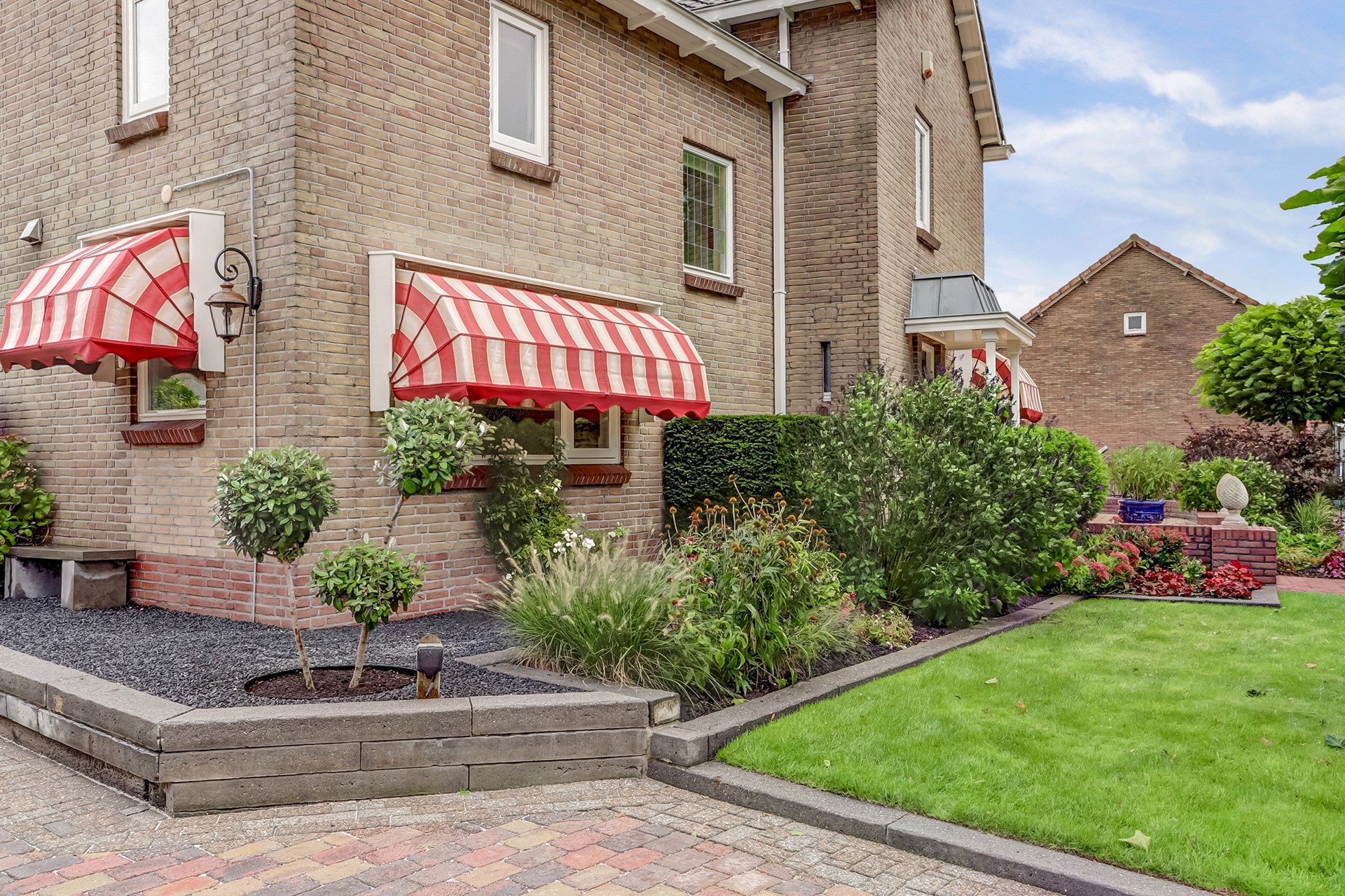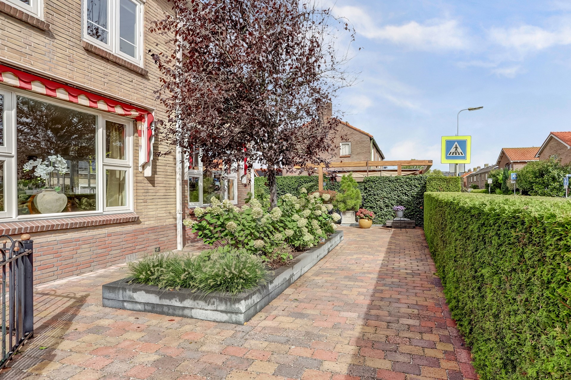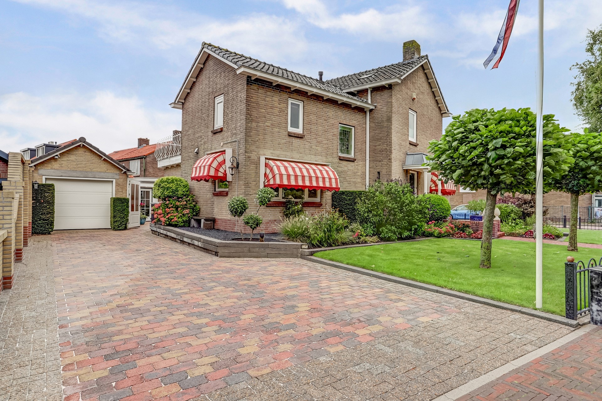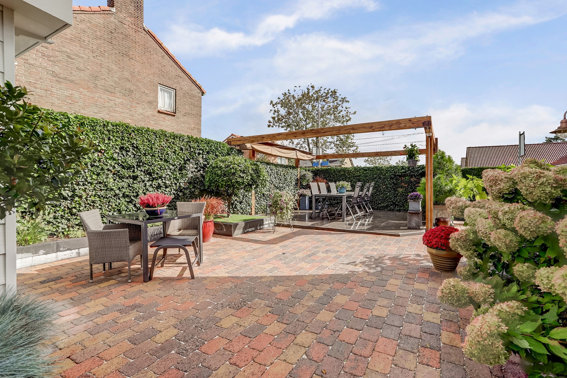 Tuin: Rondom de woning bevindt zich een fraai aangelegde, keurig onderhouden tuin. De tuin is grotendeels bestraat en voorzien van diverse vaste beplanting, een gazon (met beregeningssysteem) en een sierhaag, die veel privacy biedt. Op het terras, onder het zonnescherm (ter overname) geniet u op warme dagen van een beschutte en comfortabele buitenruimte. De royale garage biedt volop ruimte voor opslag of als werk-/hobbyruimte. Daarnaast is er voldoende parkeergelegenheid op eigen terrein, met op de oprit twee laadpunten voor elektrische voertuigen (ter overname beschikbaar).