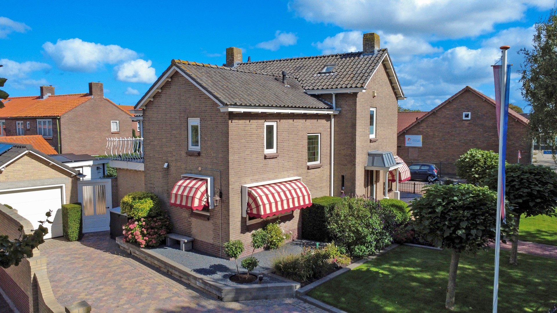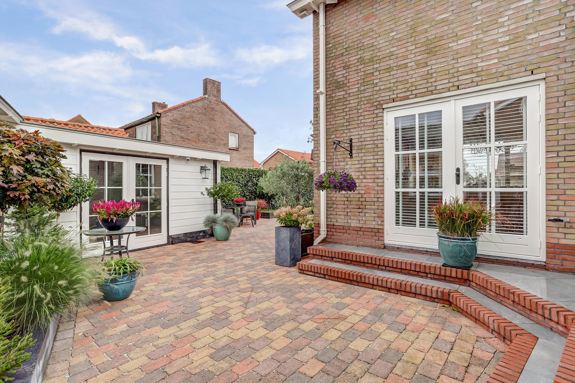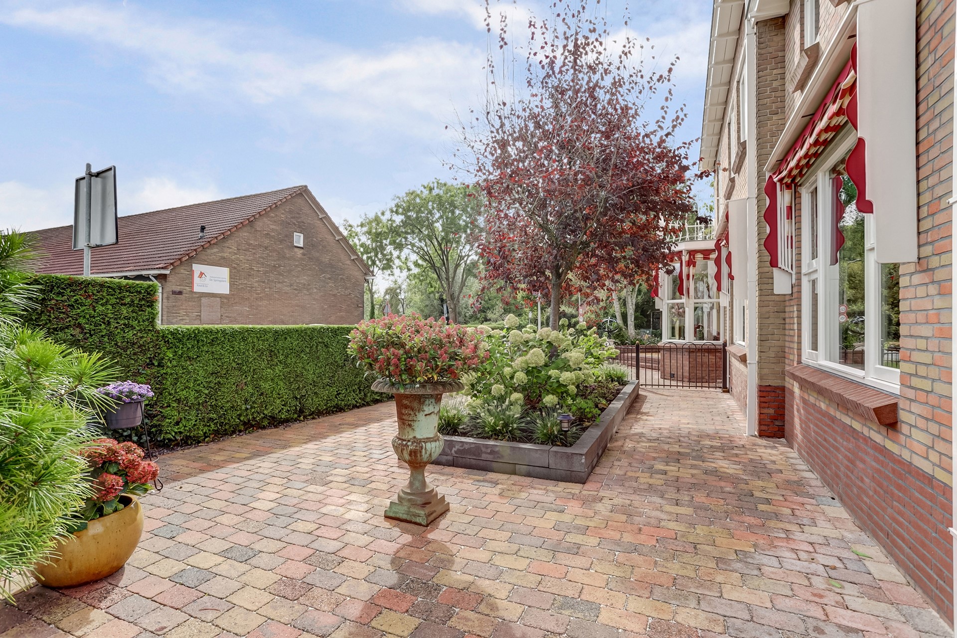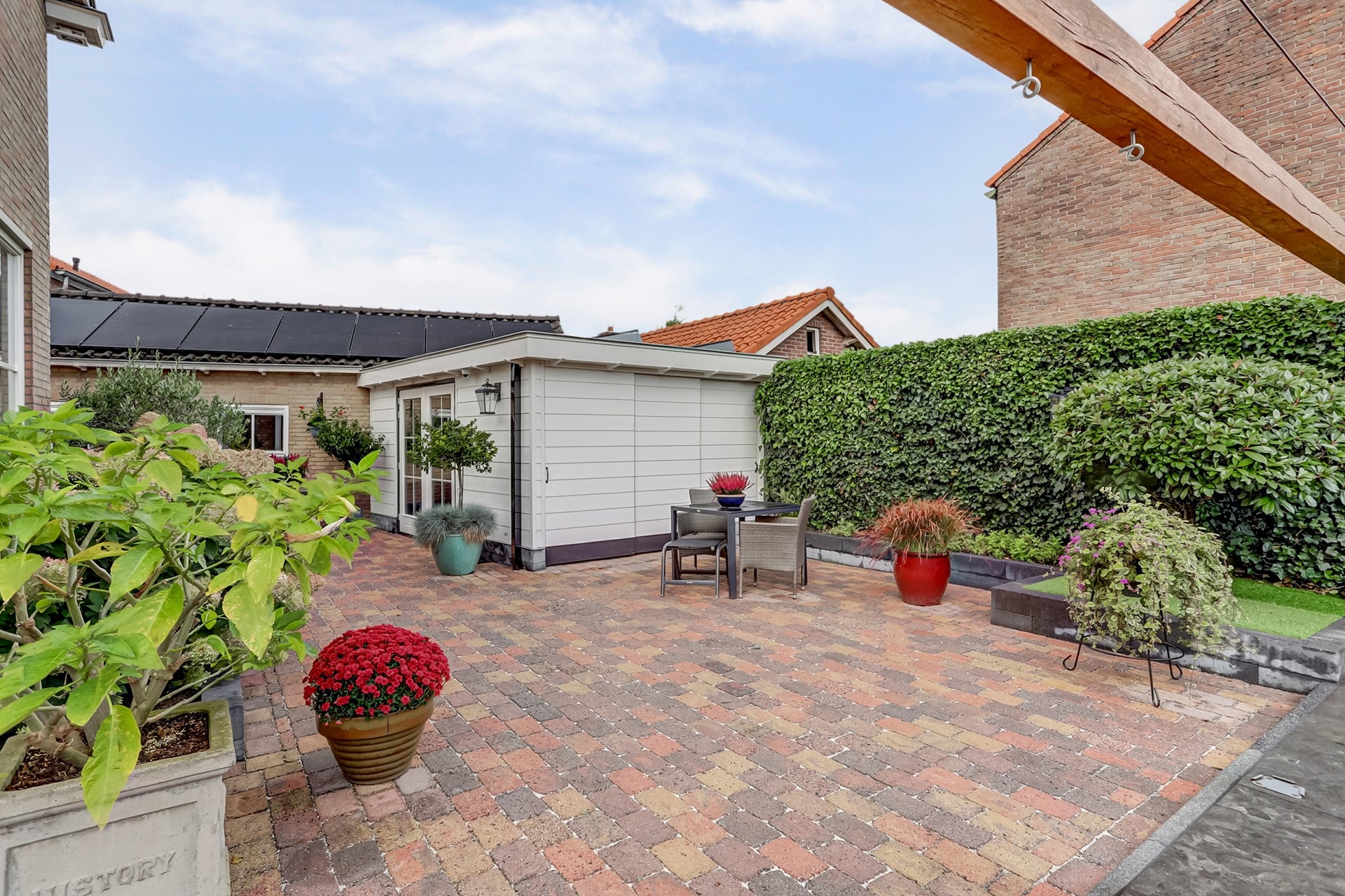 Tuin: Rondom de woning bevindt zich een fraai aangelegde, keurig onderhouden tuin. De tuin is grotendeels bestraat en voorzien van diverse vaste beplanting, een gazon (met beregeningssysteem) en een sierhaag, die veel privacy biedt. Op het terras, onder het zonnescherm (ter overname) geniet u op warme dagen van een beschutte en comfortabele buitenruimte. De royale garage biedt volop ruimte voor opslag of als werk-/hobbyruimte. Daarnaast is er voldoende parkeergelegenheid op eigen terrein, met op de oprit twee laadpunten voor elektrische voertuigen (ter overname beschikbaar).