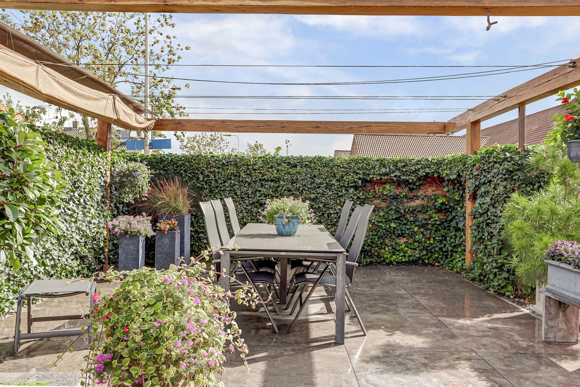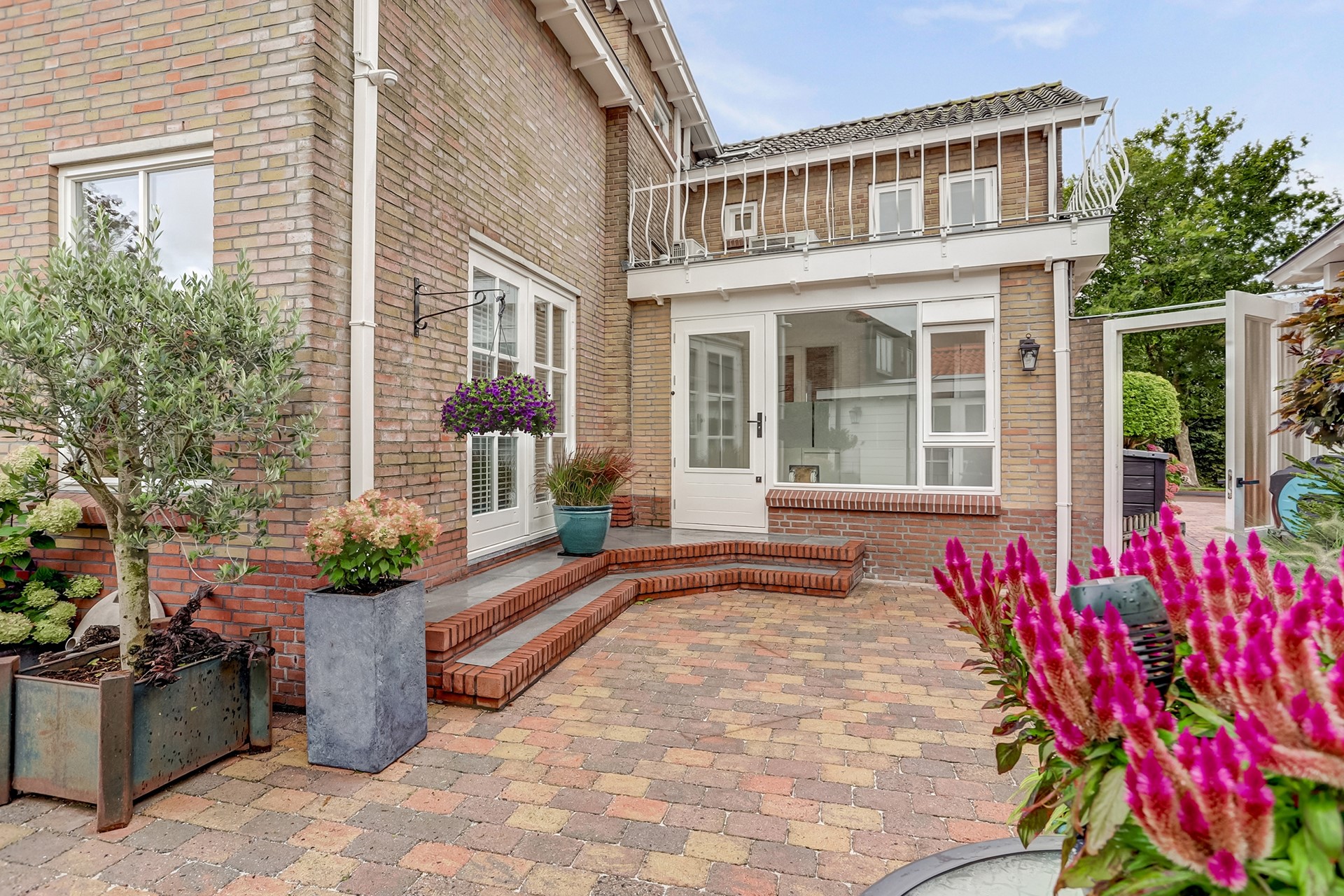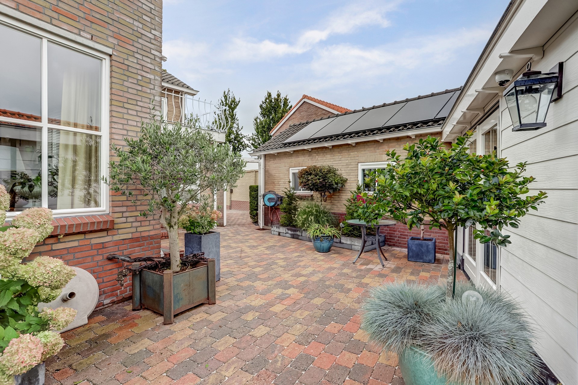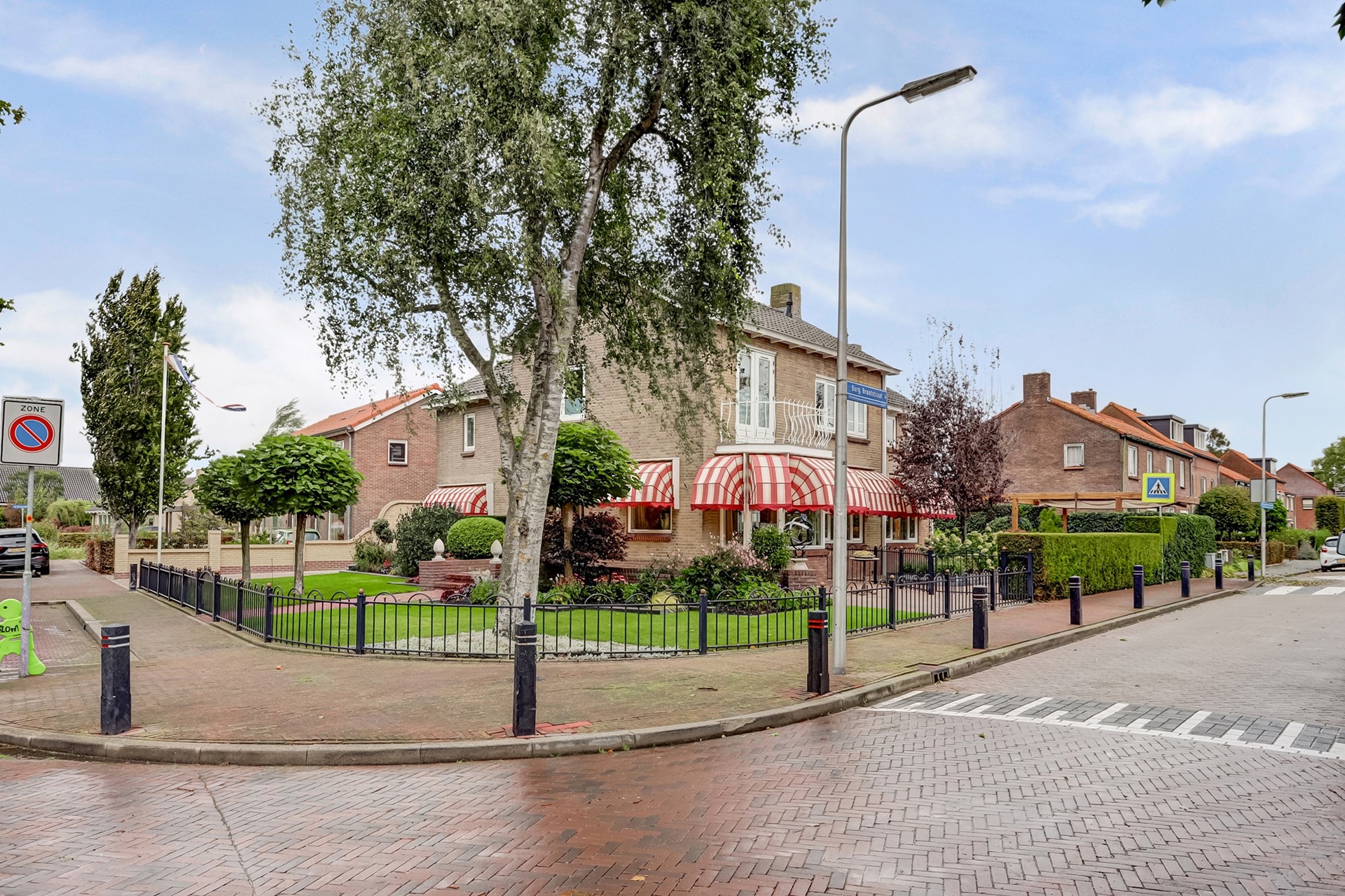 Tuin: Rondom de woning bevindt zich een fraai aangelegde, keurig onderhouden tuin. De tuin is grotendeels bestraat en voorzien van diverse vaste beplanting, een gazon (met beregeningssysteem) en een sierhaag, die veel privacy biedt. Op het terras, onder het zonnescherm (ter overname) geniet u op warme dagen van een beschutte en comfortabele buitenruimte. De royale garage biedt volop ruimte voor opslag of als werk-/hobbyruimte. Daarnaast is er voldoende parkeergelegenheid op eigen terrein, met op de oprit twee laadpunten voor elektrische voertuigen (ter overname beschikbaar).