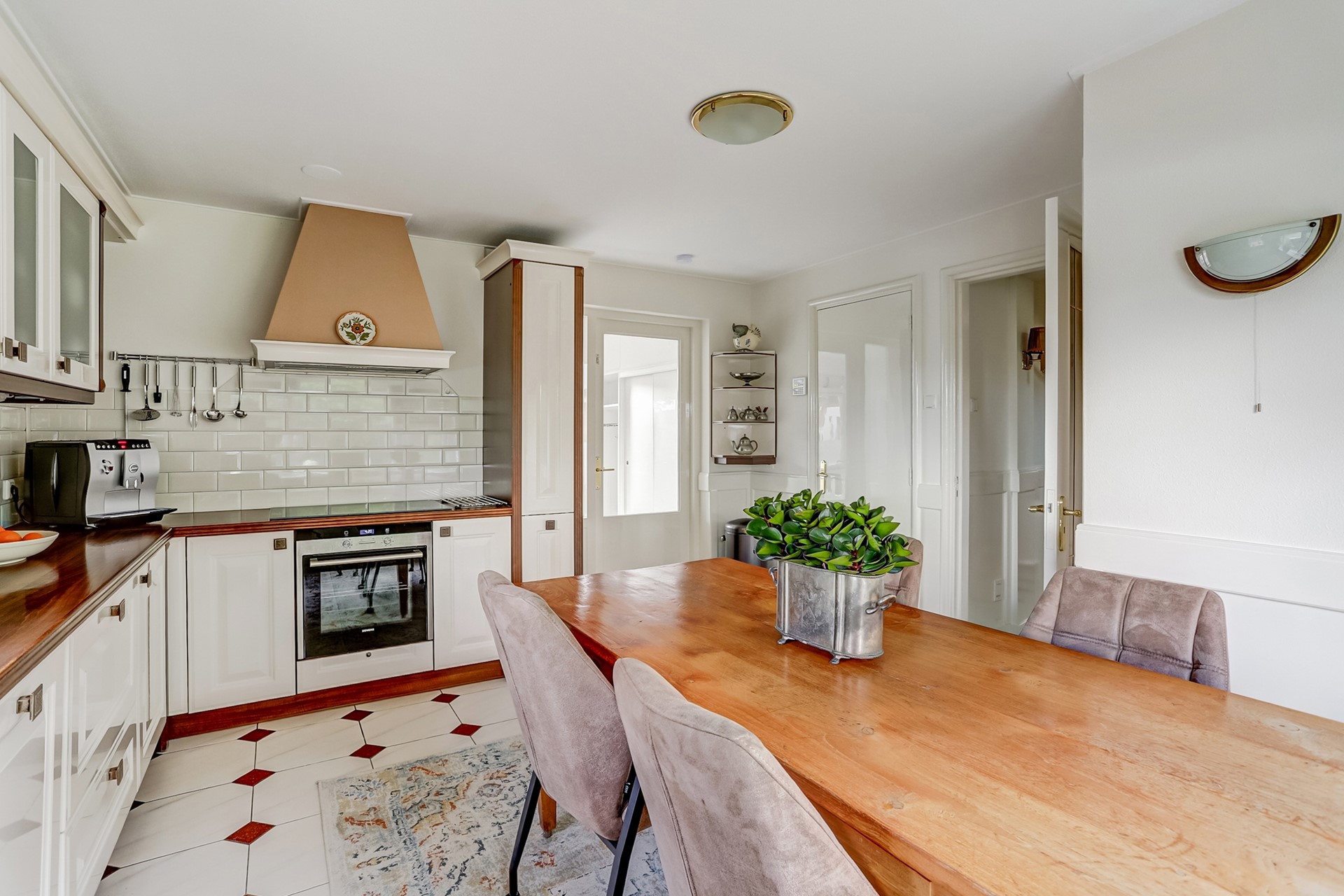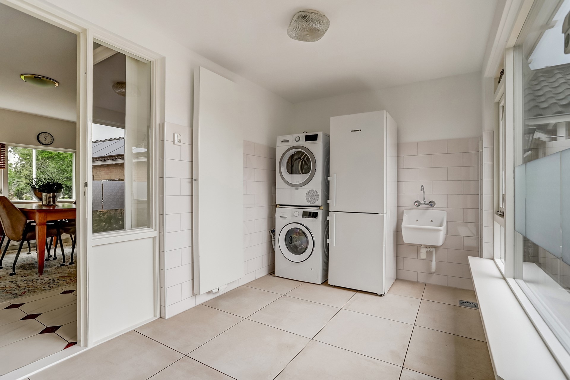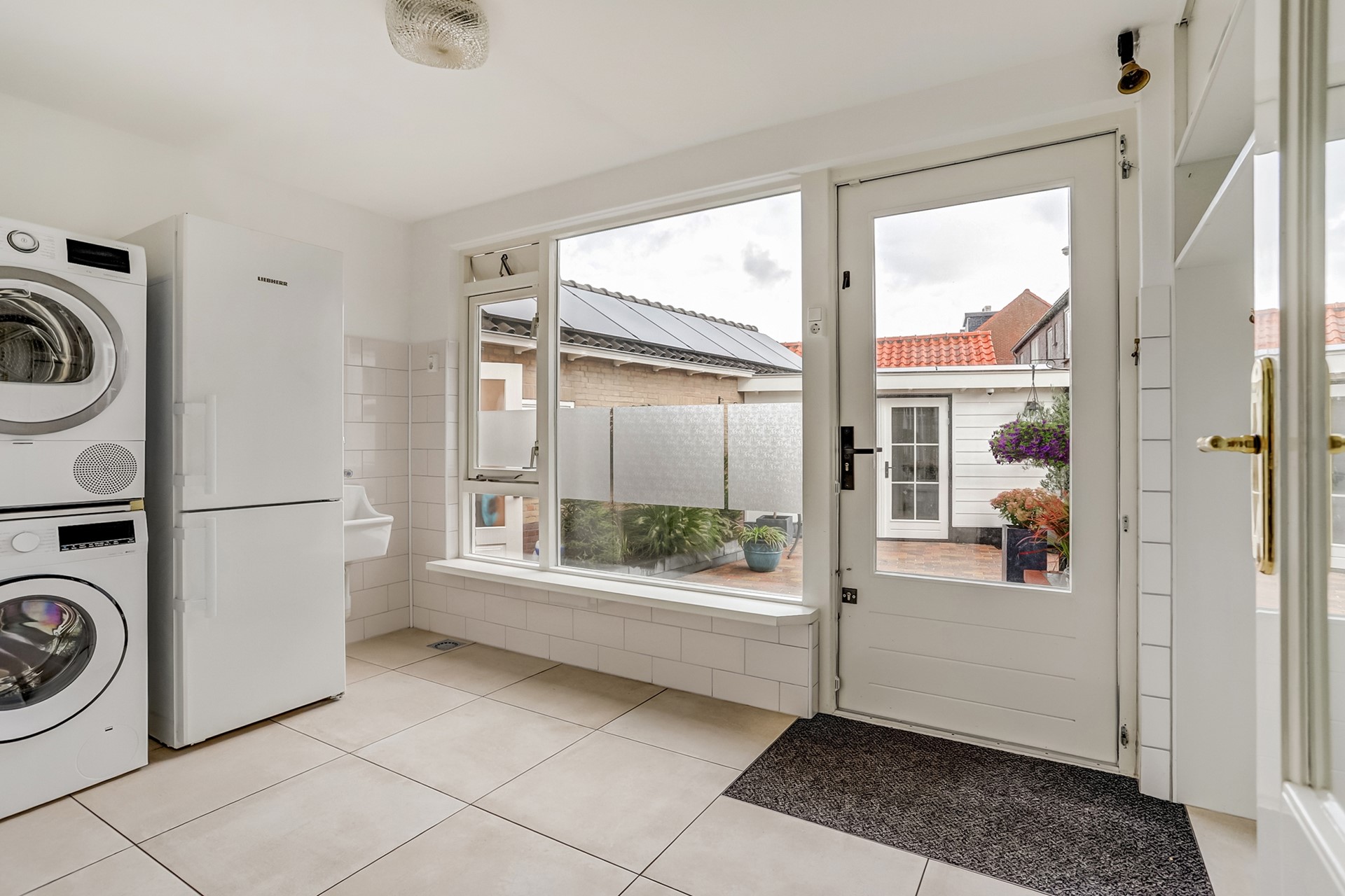 Vanuit de keuken heeft u toegang tot de opslagkelder (ca. 9,5 m²), waar zich ook de waterontharder bevindt, en tot de ruime bijkeuken met witgoedaansluiting, spoelbak en praktische inbouwkasten.