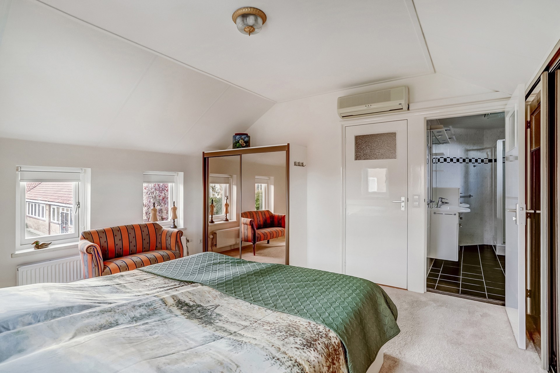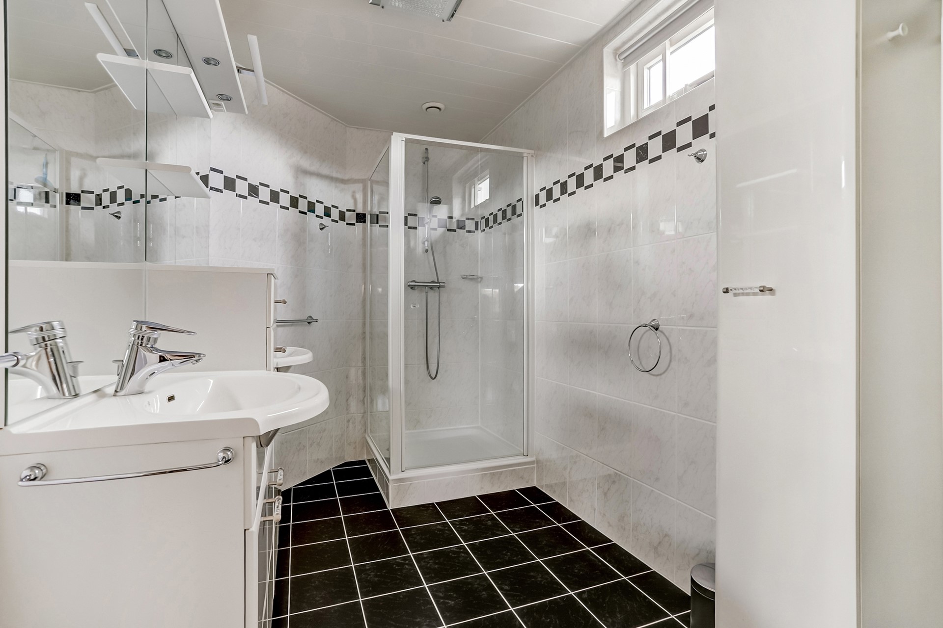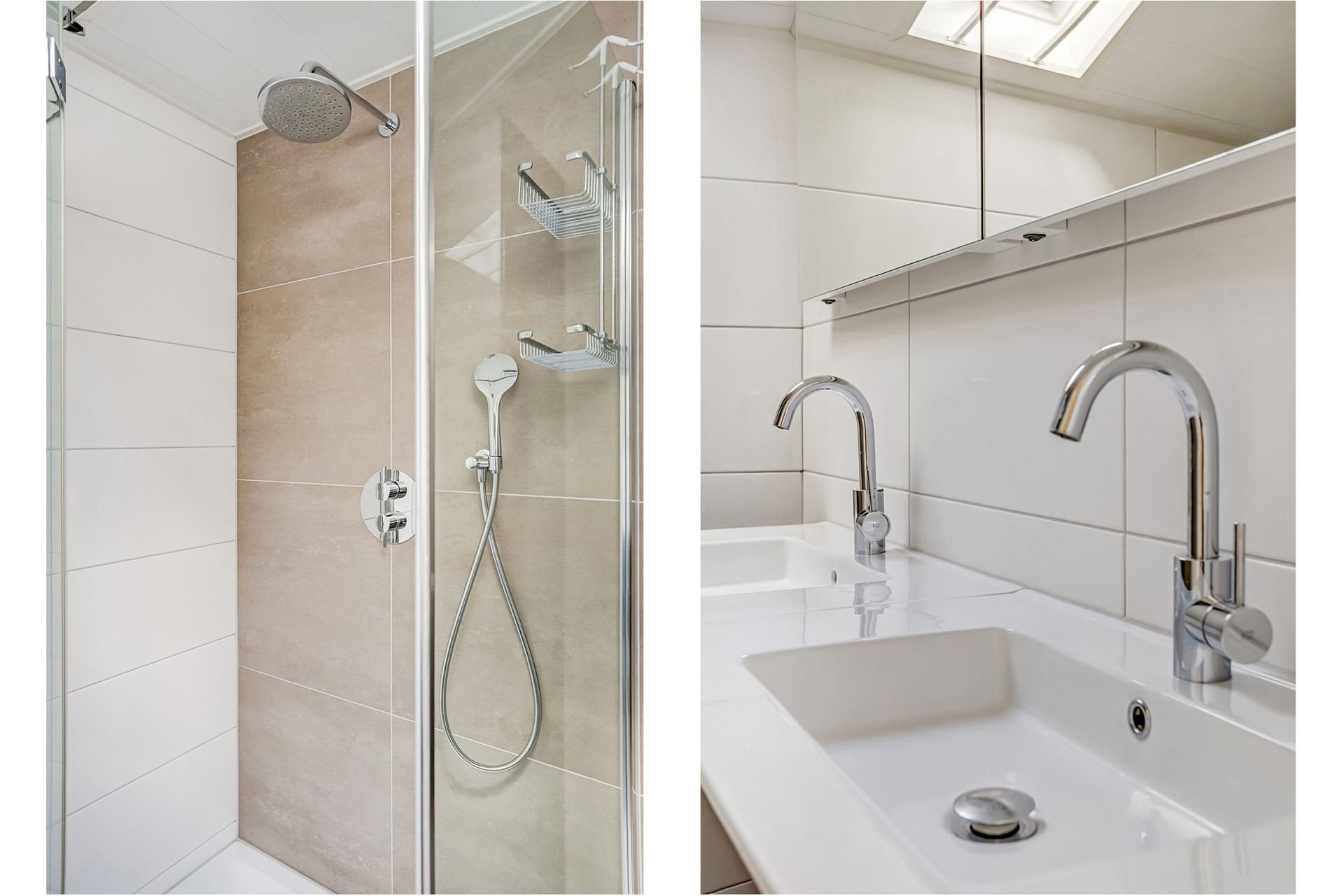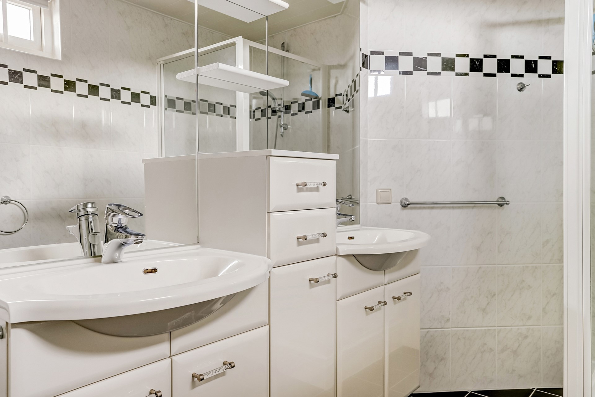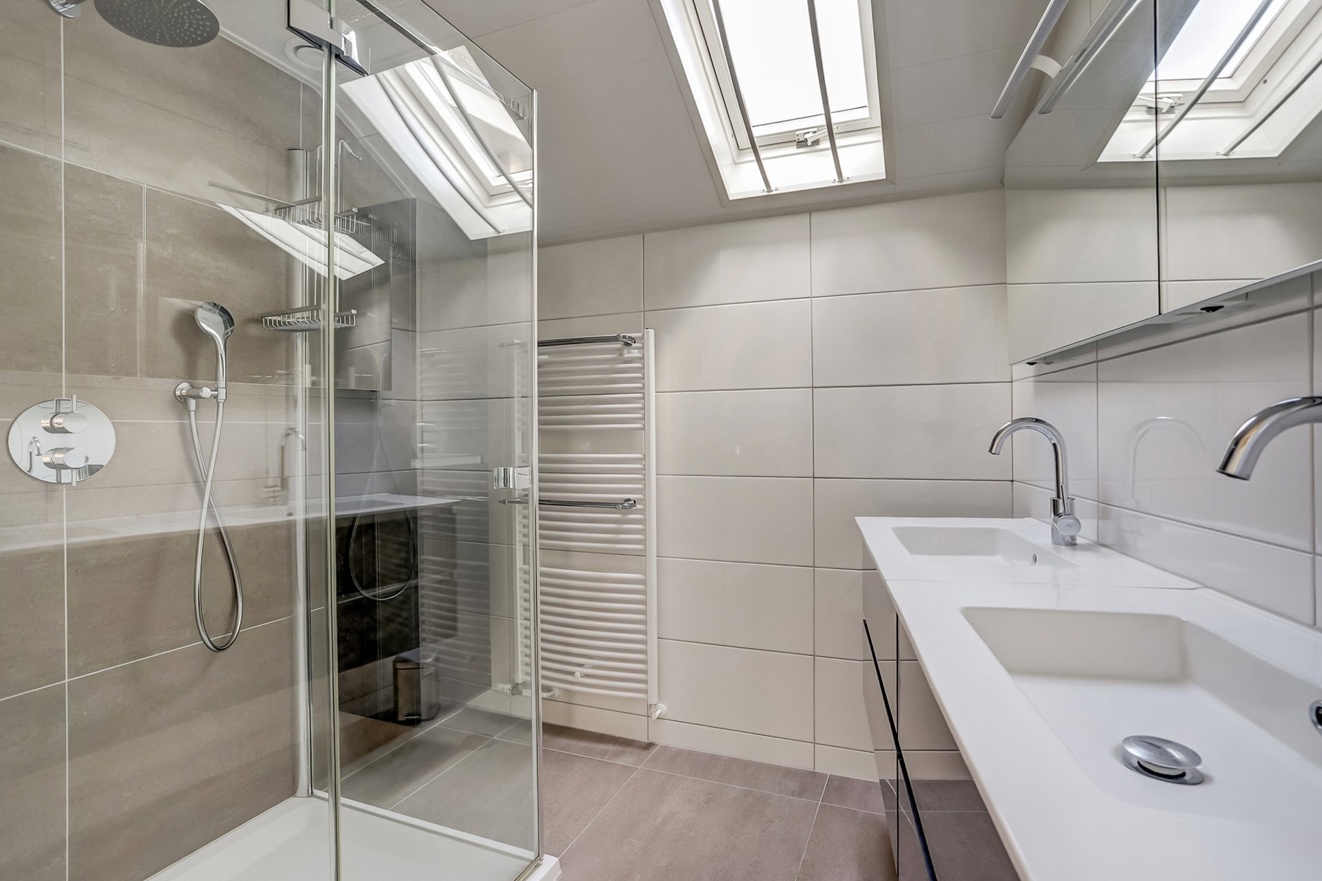 De nette badkamer (2018) is volledig betegeld en voorzien van een dubbel wastafelmeubel, douchecabine, handdoekenradiator en elektrische vloerverwarming. Daarnaast is er een tweede badkamer aanwezig, en-suite verbonden aan de master bedroom. Deze is uitgerust met een dubbel wastafelmeubel, douchecabine en design radiator.
